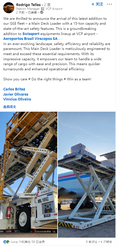 近期,由于威海廣泰集裝貨物裝載機(jī)在海外市場(chǎng)的出色作業(yè)表現(xiàn),全球領(lǐng)先的地服公司Swissport的一位相關(guān)代表在領(lǐng)英發(fā)文為廣泰產(chǎn)品點(diǎn)贊!我們很高興地宣布我們GSE車(chē)隊(duì)的最新成員的到來(lái)——一臺(tái)承載重量為15噸、具有最先進(jìn)安全功能的集裝貨物裝載機(jī)。這是Swissport在坎皮納斯國(guó)際機(jī)場(chǎng)的…